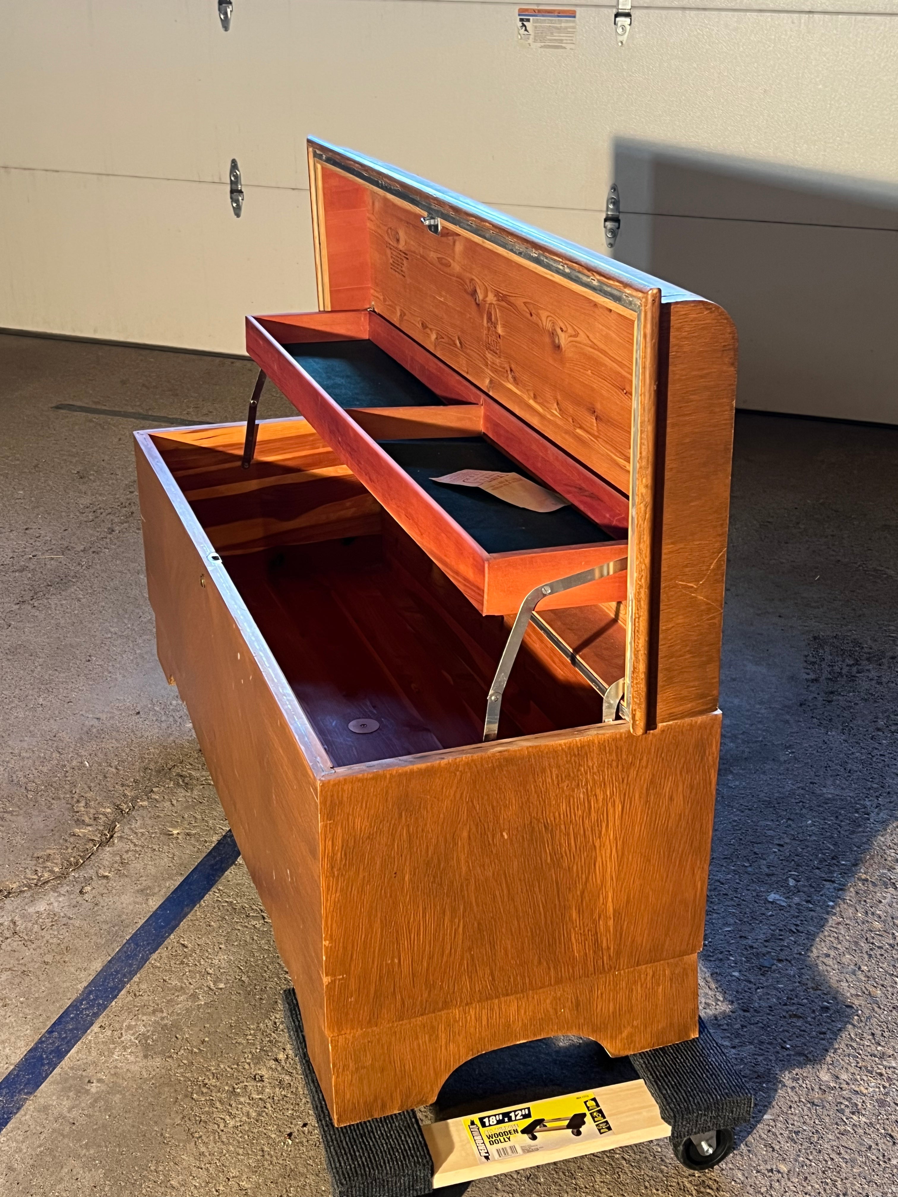 An old Lane cedar chest has lots of life left, but desperately needs a facelift. This can be custom finished.