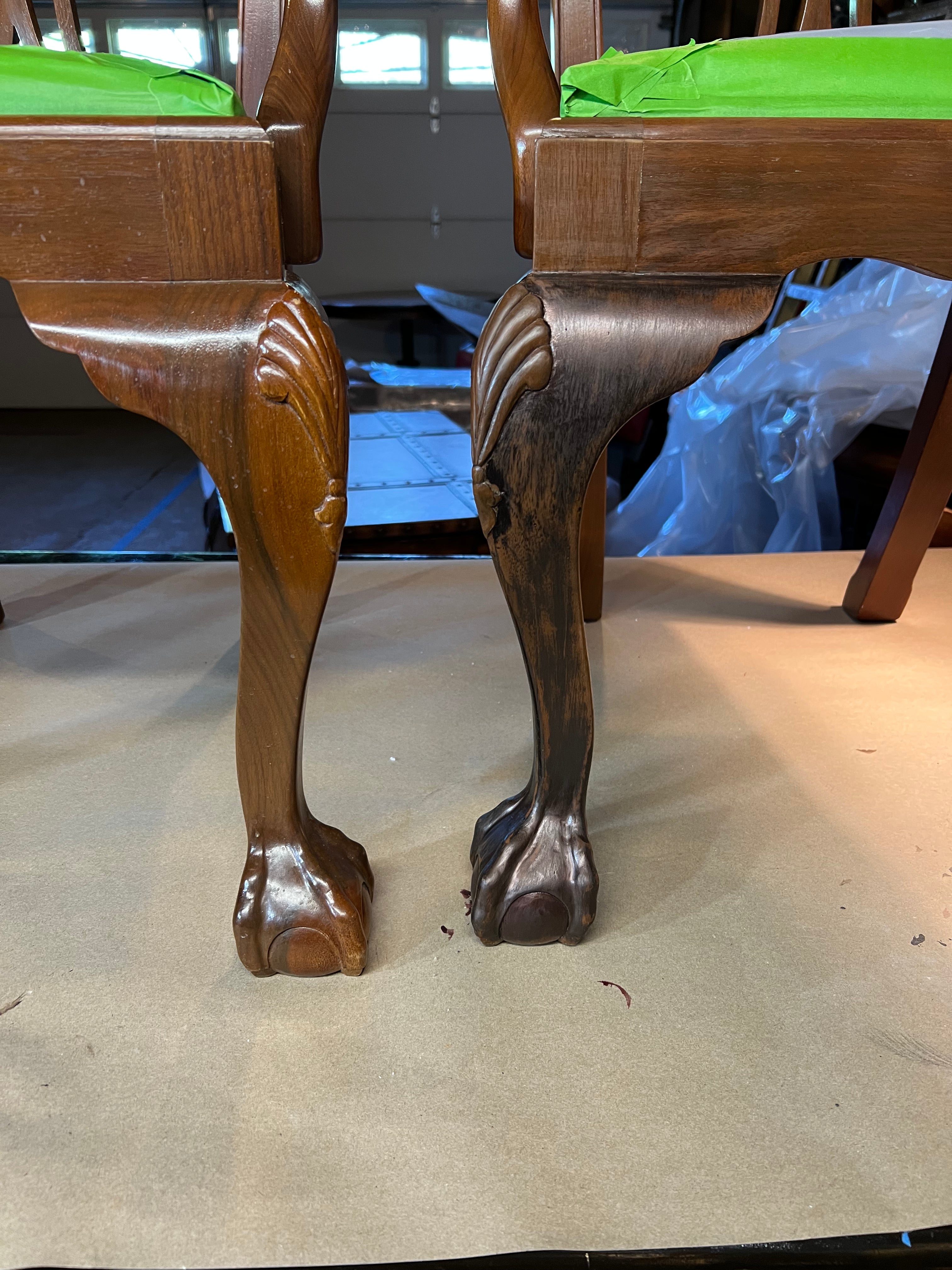 A pair of Dave Weflan chippendale-style chairs with great seats fits beautifully within The Baroque Collection, with a little work to deepen their color and bring a little sassy.